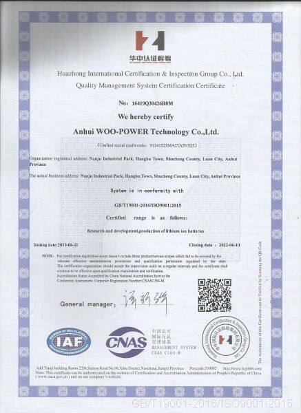 Расположенная в экономической зоне развития Хангбу в районе Шучэньского уезда, известного как «Связующая точка пяти провинций, путь к семи провинциям, внутренние территории Цзянхуайского региона и горло средней части провинции Анхой», Anhui WOO-POWER Technology Co., Ltd. является высокотехнологичной компанией, специализирующейся на сборке батарейных пакетов, разработке и продаже литий-ионных батарей. Основные продукты включают различные типы цилиндрических литий-ионных батарейных пакетов (серии 14/18/26/32), системы электротяговых батарей и системы энергоаккумулирования. Продукты компании широко используются в низкоскоростных электромобилях, базовых станциях связи, домашнем энергоаккумулировании и мини-системах аварийного энергообеспечения на открытом воздухе. Продукты пользуются высоким спросом в Китае и экспортируются в Европу, США, Юго-Восточную Азию и другие страны и регионы.